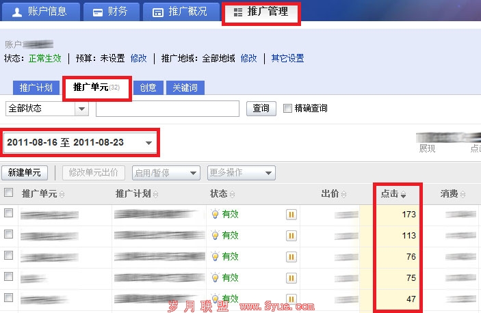 案例一:排序功能,快速定位相关信息 某旅游公司的张老板最近很开心,原因之一就是随着夏天的来临,他的推广持续着稳步上升的趋势。张老板每天都会关注点击最高的行业下,消费最高的关键词所带来的点击,以此来了解产品推广动态。这个听起来比较麻烦,但事实上张老板每天只需轻松几步,就能够实现定位: 第一步,在推广管理下的推广单元级,选择一个查看日期,点选“点击”旁的排序按钮
