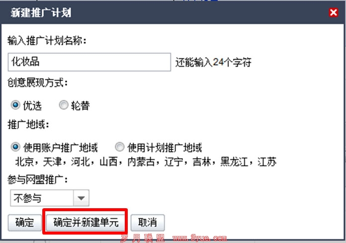 第二步,通过“新建计划”的点击,弹出一个悬浮的窗口。 在这里,徐老板可以设置推广的产品行业——化妆品行业,再根据他的需求进行新建推广计划的设置:创意展现方式是“优选”还是“轮替”(决定了徐老板广告推广的方式)、推广的地域(选择产品适宜发展的地区)和是否参与网盟推广(根据预算情况,选择“参与”或“不参与”):