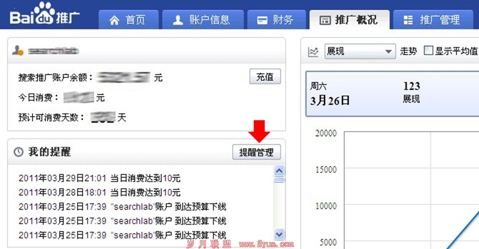 案例二:重要事件信息提醒——推广概况页,我的提醒: 由于李先生公司正处于促销活动的推广阶段 ,他需要根据重要事件信息的提示(如预算达到下线的时间,或不宜推广的关键词)调整账户中各层级对应的设定,来达到更好的推广效果。 让我们一起来看看李先生是如何操作的: 第一步,在首页推广概况下“我的提醒“框中,可以查看之前设置的一些相关提醒信息。然后,点击“提醒管理”。