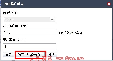 第三步,完成设置后,点击“确定并新建单元”按钮进行新建推广单元的设置。在这个阶段,徐老板可以根据产品的行业来细分该产品的类别(如:彩妆);随后,徐老板根据预算,给化妆品行业下彩妆类产品设置出价,点击“确定并添加关键词”按钮: