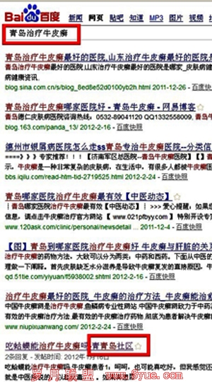 <2>将博客的标题设置为短词。我们拿“青岛治疗牛皮癣”这个词来举例,各位站长明显的可以看到有一个39博客排上来了。这就说明,一个博客的排名是非常高的,只要你使得博客每天快照,一定会有一个比较好的排名。