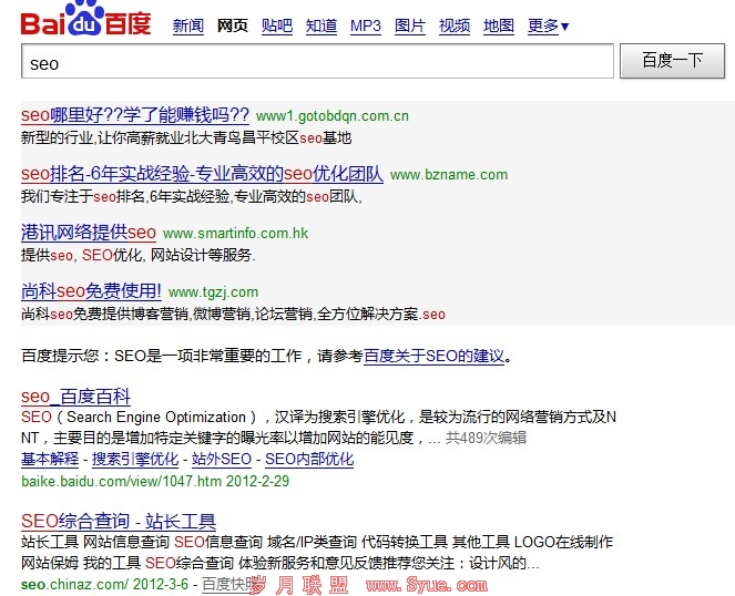 Admin5站长网3月8日消息,今日A5 SEO诊断爆料,百度搜索关键词“SEO”出现新的提示:“百度提示您:SEO是一项非常重要的工作,请参考百度关于SEO的建议。”并推出“百度关于SEO的建议”(http://www.baidu.com/search/aboutseo.html)页面。在该页面,百度简单介绍了SEO的概念以及白帽、黑帽两种SEO行为的区别和最终效果,建议站长聘请正规的白帽SEO顾问或者SEO公司可以帮助更好的优化您的网站;不要轻信一些不道德的SEO所采用的一些夸大宣传欺骗,或者使用黑帽SEO手段获取流量,最终不能达到预期效果甚至因为黑帽SEO而带来负面影响。此外,百度还力推《百度搜索引擎优化指南》(http://wenku.baidu.com/view/f576c31d650e52ea5518983f.html),建议站长按照指南进行优化获得更好的效果。目前搜索SEO、SEO优化、上海SEO等与SEO密切相关的高指数关键词均出现该提示。