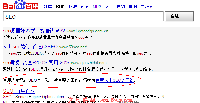 SEO是一项非常重要的工作。当你看到这句话的时候,从事SEO行业的,肯定不陌生。如果有不知情的朋友,您也不烦试下在百度搜SEO试下,搜出的结果肯定带有这么一句提示语:“百度提示您:SEO是一项非常重要的工作,请参考百度关于SEO的建议”(见图)