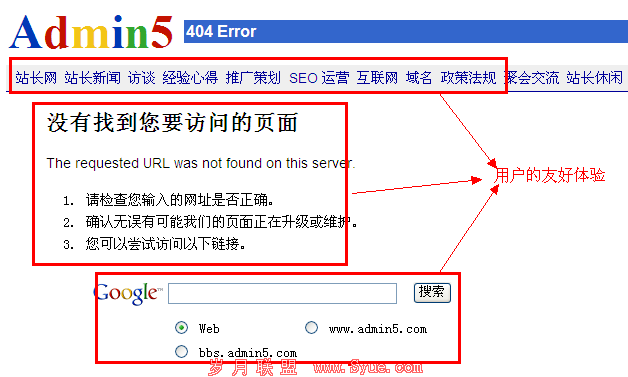 两一方面注重站点可用性的人认为,这些旧的URL地址应该保留,然后使用404错误页面来告知我们的用户这一页面已经不复存在了,并且我们需要提供相应的链接来使我们的用户找到先关的信息。对此我们可以看一下A5站长网上的404错误页面,如下图所示