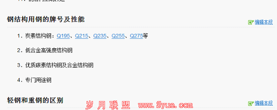 举个例子来说,“钢结构”,由于这种关键词的范围比较广泛,我们单单在钢结构这个百科词条上面就可以找出许多钢结构延伸的关键词。而且这种关键词更具有专业性,更是用户容易搜索的词,在质量上比较有保证。如下图“钢结构”百科词条截图: