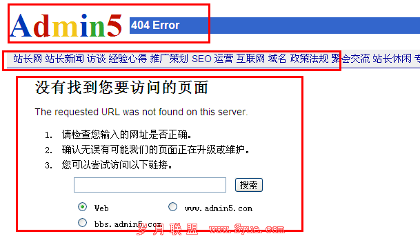 对此笔者认为出现不能访问的页面我们首先应该找到原因,并做及时的处理,如果实在无法显示就应该使用404错误页面来告诉搜索引擎及访客相关的页面已经不存在了。对此我们需要设计一个友好的404错误页面。在进行404错误页面的制作时,不要只是敷衍的制作一个简单的页面,或者干脆直接把页面跳转到首页。这将会给访客和搜索引擎留下一个不好的印象。那么我们在制作404错误页面应该注意什么细节呢?笔者将就这一问题以A5站长网的404错误页面为例分享自己的三点心得。
