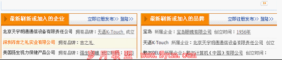 再往下就是这个网页的更新带动器:最新刷新或加入的企业、最新刷新或加入的品牌。这样就可以是他的这个网页能够经常保持更新,利于蜘蛛的抓取和快照的更新