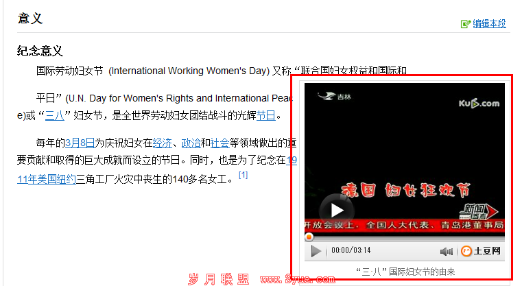 上图是是“三八妇女节”的百科词条。从上图来看,我们看到的是百科词条插入的视频是从土豆网调用的,也就是通过外部链接调用的形式来实现的。笔者估计这视频的调用会跟图片调用同属一类,大家有没有注意百科词条的图片调用时候会有一个图片参考资料链接,而这个链接也会显示在词条下方的参考资料里面,这无疑是留给我们提供外链建设的地方,而且这种词条的链接给网站带来的IP流量我想是非常可观的。
