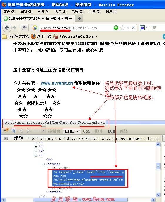我们可以从代码中看到,href后面的地址是搜搜问问的地址,点击后才会跳转到目标网站。同样将鼠标放置超链上时,浏览器左下角显示为问问的链接。再看下面那句话,祝你快乐!说得多好!