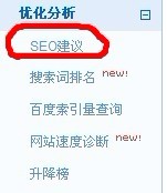 1、登陆百度统计后台之后,左侧统计功能列表下方的“优化分析”大类下面有一个“SEO建议”功能,如下图: