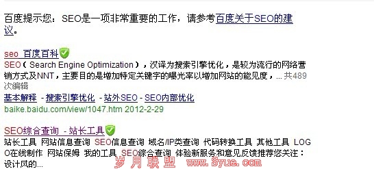 百度作为国内的一大搜索引擎,其用户使用率一直是居高不下,站长也将百度作为了国内的第一发展方向,而就在今天晚上我上百度搜了一个词“SEO”其得到的结果却并不让我满意,而且这个结果对于更多的站长来说都是一个挑战,大家先来看一张图: