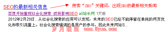 例子:当我们在百度搜索“SEO”的时候,搜索结果页面中不仅有普通的有机搜索信息,同时会出现了“SEO的相关新闻”等信息。