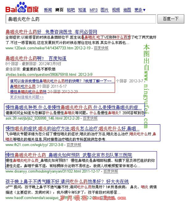 图3是关键词“鼻咽炎吃什么药”的百度搜索结果的首页首屏截图。大家都知道,对于类似“鼻咽炎吃什么药”这样的关键词,用户的意图就已经呼之欲出了。同样,用户想要获取的信息层次也传递的非常明显,就是得了“鼻咽炎”“吃什么药”。既然现在我们已经明确用户的意图,就要做到无限贴近和符合用户的需求。当然,我们不能完全满足所有用户的愿望,但最起码应该做到的是满足我们的目标受众。图3中红色标注的区域,不论是标题还是描述中都提到了关于“吃什么药”的内容,蓝色标注的区域,尽管在这个关键词中的排名较好,但不论是其标题还是描述,都缺失了用户想要的因素,其实用户的意图往往非常简单直接,他此时此刻也许并不想要知道“鼻咽炎怎么预防”、“鼻咽炎的症状”、“鼻咽炎的治疗方法”、甚至“什么是鼻咽炎”等等,他更不会知道这样的标题和描述有助于SEO的工作(99.99%的用户甚至根本没有听说过SEO)。用户只知道,他想要的,和他看到的。他在搜索结果看到了他想要的,他就有可能点击(注意我说的是有可能),但是他绝对不会点击他不想要的知道的内容。我们不要把用户的搜索行为想象得过于复杂和深奥。