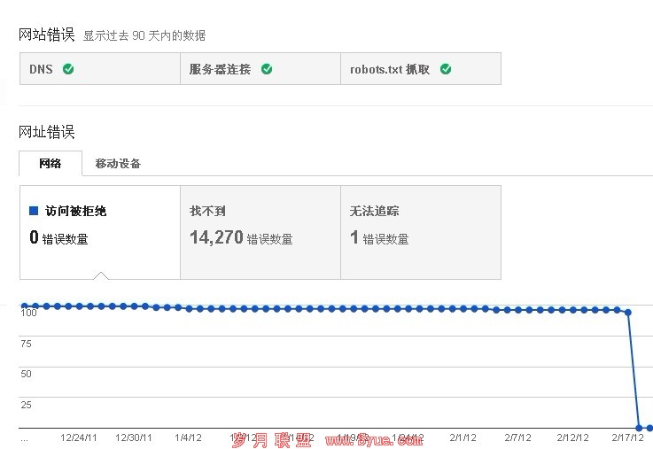 通过分析搜索查询,可以很详细的看到网站关键词搜索、点击比率,站长可以很好的对网站关键词进行掌握,包括重新定位;旁边的抓取错误统计,网站是否存在某些页面不可抓取、点击详细信息进入,可以直观的查看DNS服务器、服务器连接、robots.txt的连接状态,如下图: