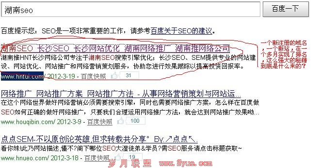 这个可是佼佼者,值得我们广大学习的榜样,为什么这么赞美人家呢?其实大家也不怎么陌生吧,一个新站哦,还是新域名注册做的,排名上去首页差不多一个月这样就实现了,许多大师都说做seo要3个月时间甚至更多的时间才有排名,到底有什么神奇力量让这个网站迅速就到首页,现在也稳定了很久了。请看下图: