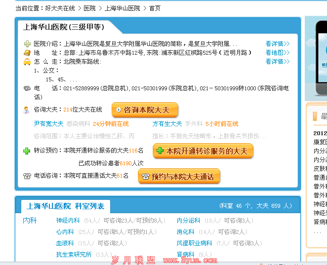 提到医疗网站大家现在肯定都会说目前这个行业的网站不好做了,百度对这行业的网站打击是比较严格的,其实百度对这个行业采取了一些措施主要还是像规范这个行业,因为医疗行业这个是和人们的生活息息相关的,如果这里都存在虚假的信息,那么最后受伤的还是我们这些老百姓。但是做医疗的朋友可以看看下面这个站,好大夫,相信大家都应该听说过这个网站。这个网站我就拿上海地区来说,上海地区的所有大医院的名字在百度上去搜索,好大夫都是排在首页的,相信这样的网站是我们这些做SEO人员的都要去学习的一个对象。