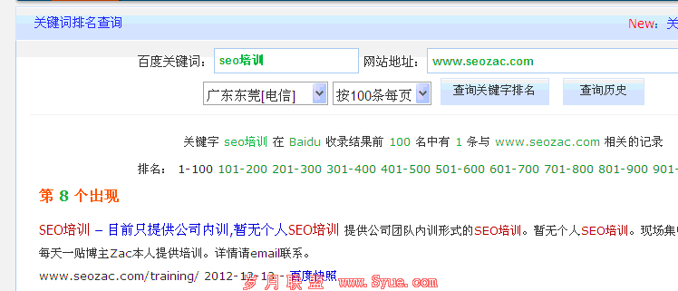 上面这张图表明一个日搜索指数在800左右的“seo培训”,seozac的内页居然排到第8位。再看快照是12月13号,这就跟“http://www.admin5.com/article/20121214/478182.shtml ”这篇文章说的相反,快照更新慢,并不代表这个页面权重不高,只能说 快照更新慢影响了页面排名继续靠前,或者说相对权重不高,不能单独说。(其实要加快内页的更新周期,只需要在内页添加最新文章板块,就OK了,起码本来三个月更新一次的内页,可能只需要半个月或一个月更新一次)