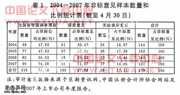 由于2004-2007年是的数据是最新的,并且处于新的审计、会计准则出台的前后期间,因此更能代表我国上市公司监事会的现时状况,对其进行分析也能有效地看出其对政策影响的反应,所以我们的样本选取区间为2004-2007四个会计年度。同时,为了提高信息可比性,我们将样本区间限定为每年法定披露期限以内公布的财务报告,即每年4月30日之前公布的上市公司年度财务报告。根据上述筛选原则,通过查阅上市公司年度报告,我们获取了在2004-2007年被注册会计师出具了非标意见的审计报告作为研究样本。样本选取结果及分析如表1所示,我们共获得2004-2007年的576个样本。