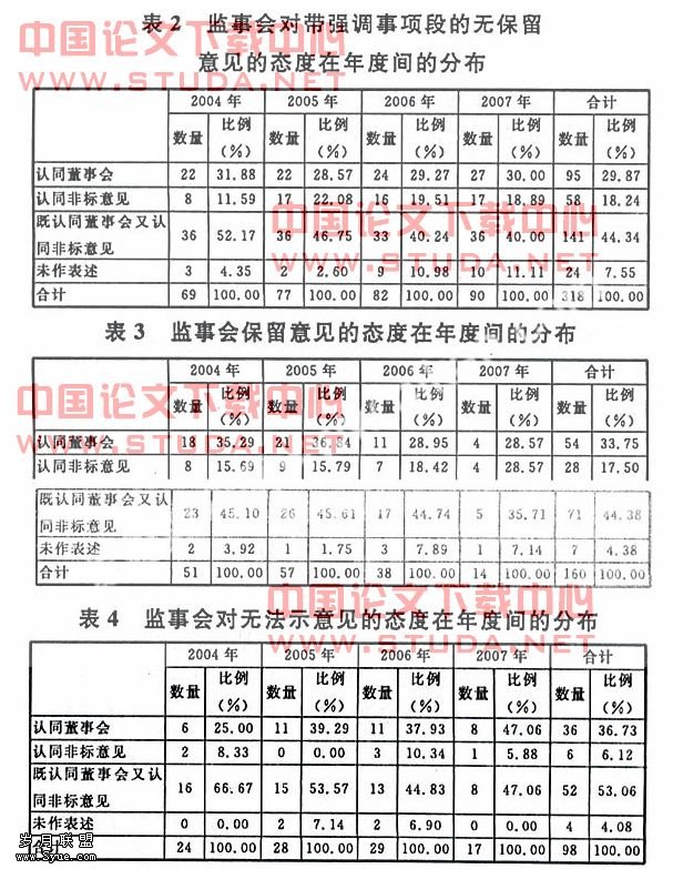 从表3可以看到,对于保留意见,监事会认同董事会的态度数量和比例从2006年开始在逐年减少;而认同非标意见的态度数量却在同时减少,但其比例却在大幅增加,这表明监事会正逐步发挥其财务监督作用,内部治理有效性在增加;既认同董事会又认同保留意见的态度数量同期持续减少,这也表明在保留意见问题上,监事会态度逐渐清晰;而未作表述组数量变化趋势不明显,因其总体数量偏小,因此不具有代表性。?