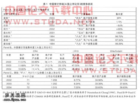 鉴于发达证券审计市场寡占型的市场结构,国内部分研究者将市场集中度的高低与审计质量供给联系起来(如余玉苗,2001;夏冬林和林震昃,2003;刘明辉等,2003),认为我国审计质量不高的原因在于市场较高的竞争程度。但是,笔者认为该观点首先忽略了一个基本事实:即使是发达市场国家如美国,寡占型的审计市场结构的形成亦经历了一个较为漫长的过程,总的来说是市场竞争和选择的结果。而我国目前的审计市场结构的形成有其原因,从1997年深圳会计师事务所脱钩改制试点算起,到1999年底全行业完成改制,审计市场才真正走出了行政垄断,开始逐步转向市场化的自由竞争阶段,市场集中度不高是历史造成的现状,是情理之中的事情(易琮,2002),并非市场演进的结果。