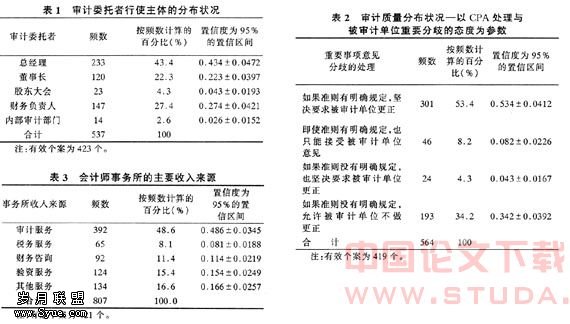 审计委托模式之所以对CPA的职业态度和执业质量产生至关重要的影响,在于审计收费是会计师事务所最主要的收入来源。在有效的423份调查数据中,421名CPA对本所主要收入来源作了回答,详情见表3。由于审计业务几乎关系到每一家事务所的生死存亡,在管理当局控制着审计委托权的时候,会计师事务所和CPA在与公司管理当局的博弈中常常处于弱势地位,从而无法保持应有的独立性,不得不出具管理当局偏好的审计报告。