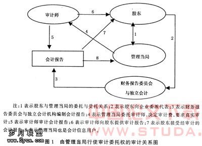 以上理论研究的成果和成功的企业实践从不同的角度证明由独立的财务报告委员会行使会计流程控制权的可行性。当企业由财务报告委员会和独立会计机构全程负责会计信息生产后,审计委托权将不再是一个敏感的话题,对高质量审计服务的需求是会计信息供需双方的共同选择,此时审计委托权由会计信息的任一需求方行使都会带来相同的结果。审计又回到了最初设计的正确轨道上,虽然审计委托人不一定是股东。当然,比较而言,管理当局继续行使审计委托权的交易成本最低。由管理当局行使审计委托权的审计关系如图1。