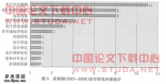图3不仅反映了2001-2006反倾销会计研究内容的分布状况,同时还揭示了会计领域在反倾销研究中所涉及的一些前沿问题。其中,反倾销会计应对策略的文献有11篇,居首位;反倾销会计准则与制度及其成本核算的研究文献分别为8篇。说明这三个板块的内容是以往反倾销会计研究、关注的热点。笔者认为原因如下: