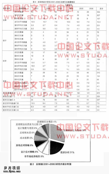 表4起码传递了这样一些信息:一是平均引文数。五年间反倾销相关文献的平均引文数是7.5条,其中最多的是,其总引文平均数量达到了10.4篇;其次是经济类的文献有8.2篇;然后是贸易有5.5篇;最少的是会计类的文献,仅有4.8篇。二是引文结构分析。由表中数据可知,外国文献基本上多于国内文献,是我国反倾销研究的一大特点。从2001-2006年,国内引文所占比重最高的是2003年(为64.4%),而国外引文的各年比重都在35%以上,2002年将近50%。就反倾销会计文献而言,国内平均引文量4.5篇,国外平均引文量0.3篇。综上,无论从平均引文数量,还是引文结构上看,应当站在全球视野,关注反倾销会计的研究。