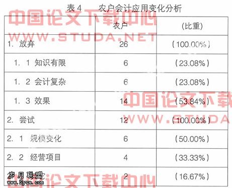 从调查数据来分析(见表4),导致农户放弃记账的主要因素是会计应用效果。余干县的张某是一个很有进取心的青年农民,具有高中文化,除经营一些田地外,还承包了一口水塘养鱼。“我以前的确有记账的习惯,可能是由于对会计不太了解吧,所以,总觉得(记账的)作用不大……我将大钱弄清楚就够了。”通过调查也发现,导致农户愿意尝试会计的动因是经营规模的扩大和经营项目的复杂化。永丰的罗某也是一个典型:“如今我承包的一个山地,每年投资也不少,因此,我必须把账目理清楚才行。”