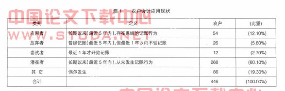 在我国会计界较早就有学者从事农户会计的应用与发展研究,并将农户家庭会计活动称之为农户会计。如于玉林教授(1994)认为中国农户会计应具有以下基本特点:农户会计主体是农户;农户核算内容的重点随产品的成本费用核算和产品收入核算;核算方法应简化、实用;农户会计工作具有兼职性的特点湖北的张炳生(2001)曾撰文认为,农户家庭会计设计,应做到既要反映农户经济活动内容,满足自身经济管理的需要;又要从通俗易懂、简明出发,达到会计核算规范化的目的;建账对象应是经济项目多,收支业务量大,又有一定文化基础的专业户。马巾英(2000)对中国农户会计体系的构建提出了的一些建设性意见。张琳认为(2004),由于现阶段我国农户家庭生产经营方式具有自主经营,自负盈亏的特点。因此,中国农户会计具有管理会计的一般性质和特征。那么,农户会计应用的动机是什么?农户会计应用的制约因素是什么?显然,这些与农户会计应用相关的深层次问题总体研究深度不够。对这些问题的探索对于中国农户会计框架的研究具有特别意义。