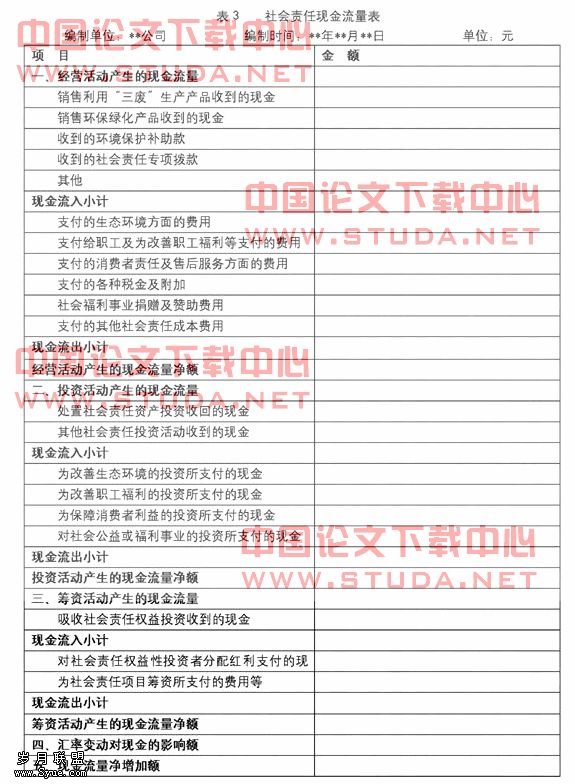 但是,基于经济和社会可持续的必要性和企业建立社会责任会计及其披露机制的紧迫性,本文建议:对于未上市的企业,应要求其在现有报告中增设反映社会责任信息的内容;对于上市公司中的规模相对较小的企业,应要求其在报告中增设反映上文所提到的全部五个方面的社会责任会计信息;对于上市公司中的大型企业,应要求其编制独立的社会责任会计报告,至少反映上文所提到的全部五个方面的社会责任会计信息,独立的社会责任会计报告应以以前传统的三大报表(社会责任资产负债表、社会责任利润表、社会责任现金流量表)所披露的定量数据为核心,关于社会责任的定性描述可以在附注中加以披露。(报表设计如上所示)