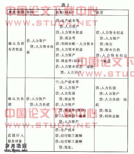 第三种类型是确认为所有者权益。①企业一旦与职员签订合同就按照将来可能发生的现金流出的确认为一项所有者权益,同时确认为一项资产。这样处理事实上承认人力资本对公司剩余收益的拥有权,意味着在后续的会计处理中人力资本产权的权益会随人力资本产权资产价值变化而变化。设置人力资产与人力资本权益两个会计账户,其中人力资产为资产类账户,人力资本权益为所有者权益类账户。②在运用人力资本产权时,人力资产的价值转入相关具体服务对象,发生的薪酬支出冲减人力资本权益,在企业取得剩余收益的时候按照合同的约定提取一部分给人力资本,增加人力资本权益;并按期检查人力资产的价值,如果价值减少,则一方面减少人力资产帐面价值,另一方面计入人力资本权益的减值明细账户。这种会计处理可以表示人力资本对企业所有权的分享,同时也能说明人力资本对企业的贡献与权益。发生的培训费用计入人力资产。③企业处置人力资本产权时,对个人会有一些现金补偿,先将这些现金支出与人力资产合并,然后与人力资本权益对冲。虽然在各个会计期间已经检测了人力资产价值,并且同时调整了人力资本权益,但是人力资本权益参与剩余收益分配,所以在处置时两者会存在数量上的差异。这些差异记入企业的资本公积。有关分录列示在表一中。?