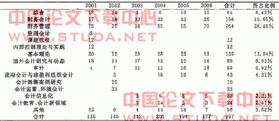 随着社会的不断进步、的不断发展,人们渐趋关注新事物。会计新领域及新问题的研究成为会计学家们研究的重点,2001-2006年期间发表在《会计研究》上的关于会计新领域的文章主要有:环境会计(16篇)、人力资源会计(6篇)、衍生金融工具会计(2篇)、通货膨胀会计(0篇)、无形资产会计(6篇)与知识产权会计(2 篇)等。其中,关于环境会计的研究以2002年最多(9篇)。从数量上看,会计学家对这些新领域新问题的研究还尚待加强,还应该不断完善新理论体系,为我国经济发展提供新的会计支持。从发展来看,会计新领域新问题的研究正处于新兴发展之中,越来越多的会计学家致力从事这些问题的研究,在2006年9月《会计研究》上中国会计学会对“会计新领域与新问题”的研究征稿,足以说明这类问题的研究已成为我国会计研究的一个新方向,同样在2007年上半年的《会计研究》论文中也可以得以印证。?