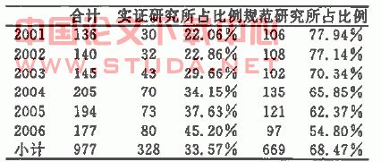 《会计研究》1992年~2001年的1130篇文章,规范性研究的有1040篇;实证研究的有90篇,对比2001-2006年的数据可以看出,在研究方法上实证研究的份量在逐渐加大,且实证会计研究方法的应用在近两年有显著发展,其在2001-2006年各年度的情况如表3所示:?