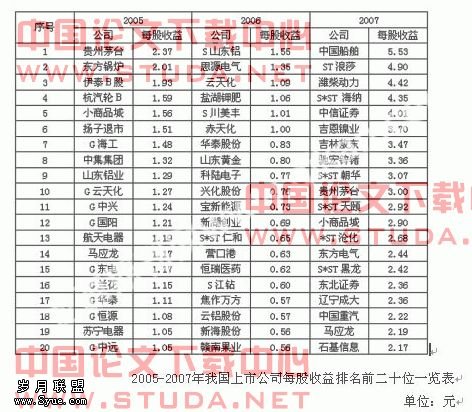 新的每股收益准则的实施产生了很明显的经济后果,对公司特别是上市公司的每股收益的也产生了很大的影响,下面就2005-2007年这三年每股收益从高到低排在前二十位的上市公司的数据进行比较分析,以揭示每股收益准则产生的经济后果。