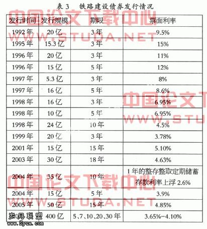 铁路基础性项目和竞争性项目均可以进行债务性融资。铁路债务融资主要包括国内银行贷款、外资和铁路债券,其资金成本要根据不同时期国家的货币信贷政策和利率政策确定。国内长期银行贷款的资金成本一般高于同期铁路的总资产报酬率,资金成本过高限制了铁路的盈利能力,收益受到极大的影响。随着还本付息压力的逐渐增大,债务融资应有一个限度。负债规模的指标为资产负债率。铁路适度的负债规模可以通过铁路的总资产报酬率水平和资金成本来判断。第一,如果铁路总资产报酬率大于负债利率,则能够通过举债获得避税优惠;第二,铁路总资产报酬率小于负债率但大于负债利率与资产负债率的乘积,股东利益开始受到侵蚀,逐渐落入债务陷阱;第三,铁路总资本报酬率小于负债利率与资产负债率的乘积,铁路处于亏损状态。可接受的负债规模由多重因素决定。以铁路年度经营净利润为正的目标值,可以根据一个阶段平均税前利润,假定未来平均税前利润以一个年均率增长,在该阶段的利率水平下,根据债务融资的敏感性分析确定可以增加的负债规模,从而可以承受的负债规模极限值。有研究数据表明,2002年铁路的总资本报酬率已经低于债务融资的资金成本,尤其是低于国内银行贷款利率,加之考虑到未来银行利率上调的可能性,使铁路的负债空间可能更小。 债务性融资工具有几类。一是国内银行贷款,是目前铁道部主要的筹资方式。基于铁道部独特的信用资质和当前国内银行充裕的资金状况,国家开发银行和各商业银行对铁道部放款的态度十分积极。由于我国的利率管制,借款成本的弹性较小、债务成本偏高、负债空间有限,对经营构成一定的压力,信用优势没有在融资成本上体现,铁道部良好的信用资质无法得到“变现”。二是铁路债券,在我国债券市场发行次数最多、累计发行量最大,铁道部根据我国利率水平处于较低时期的有利时机,充分运用市场机制,创新铁路融资方式,加大了铁路债券融资的力度(见表3)。2007年铁路建设债券600亿元分两期发行完毕,创年度企业债券发行量最大规模。铁路建设债券通过资本市场直接融资,扩大规模发行,充分发挥了市场定价作用,满足了机构投资者资产配置需求,丰富了债券市场投资品种,对扩大债券市场容量和提高债券交易活跃程度,发挥了积极作用。有资深人士认为,铁道部目前负债率不算太高,铁路发债空间仍然很大。但是我国铁路对债券市场的利用程度不够,发行主体较少,仍然需要进一步拓展发行债券的市场。三是利用外资,主要包括有世界银行贷款、日本海外协力基金贷款,以及亚洲开发银行贷款,澳大利亚、德国、加拿大、奥地利等国家政府提供的贷款,外资的数量十分有限,存在一定的汇率风险。2006年,铁路建设吸引外资27.72亿元。
