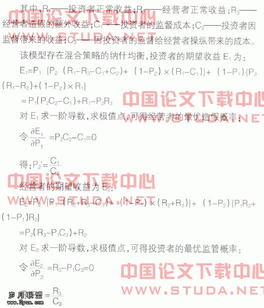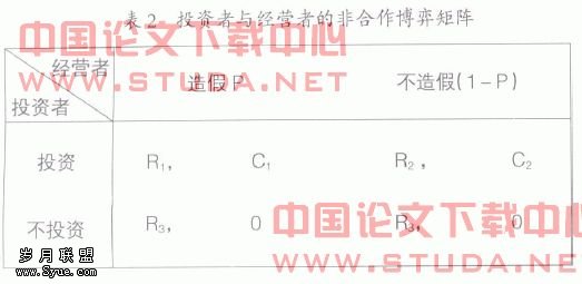 在完全信息条件下,在C1>C2时,纳什均衡为(不投资,造假);在C1<C2时,纳什均衡为(投资,不造假)。现实生活中,投资者对经营者是否造假往往不得而知,而只能认为经营者以概率P造假,以(1-P)不造假。