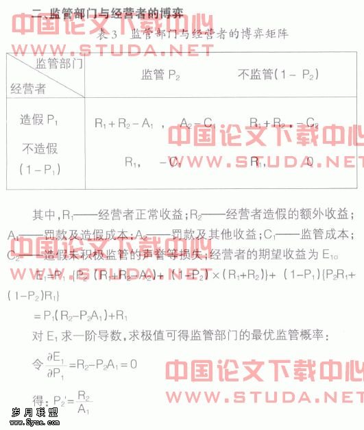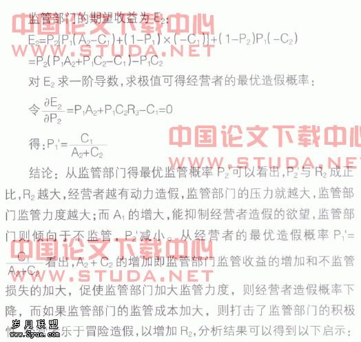 结论:从博弈的分析结果可以看到,从经营者的最优造假概率 P2'与C1成正比,与C2成反比,即随着投资者监督成本的提高,投资者放弃积极监督的可能性增大,经营者造假的概率也随之增大;而在C1一定的情况下,如果投资者监督的收益C2提高,投资者便会有动力积极监督经营者,使经营者造假的概率P2'随之下降。从投资者最优监督概率P1'可以看到,与R3成正比,随着经营者造假的额外收益R3的增加,经营者会想尽办法造假,由此对投资者的侵害就会越大,投资者为维护自身权益,对经营者监督的概率就会加大;而如果由于投资者的严厉监督使经营者造假成本提高,即C3提高,经营者造假的可能就会减小,当C3大于R3时,经营者停止造假,对外呈现出诚信的形象,投资者的监督概率P1'随之减小。由此带来的启示是:第一,减少投资者监督成本,对于有资格“用手投票”的投资者而言,为解决委托代理造成的信息不对称问题,较好的解决途径是建立良好的公司治理制度;第二,要加强对投资者保护,强化投资者监督意识,完善相关法律体系,增加投资者监督意识;第三,增加经营者造假成本,从而减少造假的额外受益,可以通过法律上的制裁、经济上的处罚以及舆论的影响等途径实现。