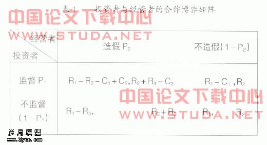 1. 在合作博弈中,由于经营者与投资者的效用函数不尽相同,经营者有可能出于增大自身效用的目的,采用错报、漏报等会计手段对会计报表进行粉饰。在表1的博弈模型中,将这种行为选择统称为造假。经营者造假会危害投资者利益,为维护自身利益,投资者可能选择对经营者进行监督,由此可以建立以下的博弈模型进行分析: