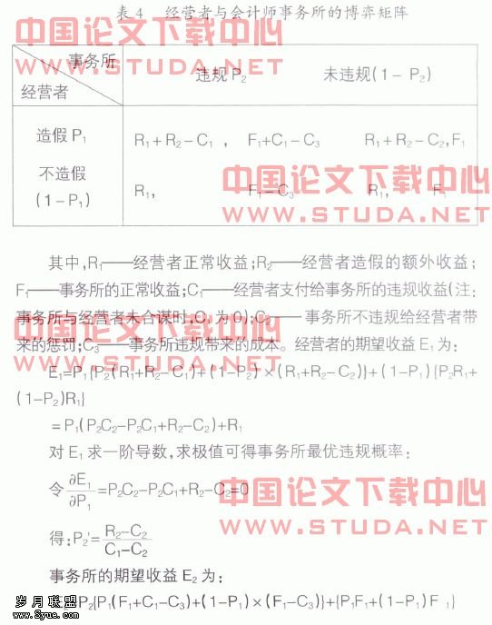 结论:在对经营者的惩罚C2一定的情况下,经营者造假的额外收益越小,造假所需支付给事务所的费用越多,经营者就越没有积极性造假。事务所合谋造假的可能性就越小。如果加大惩罚力度,即C2越大,经营者造假的可能性同样会降低,P2降低。