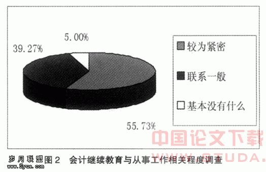 在对会计继续教育与从事工作相关程度的调查中,有579份认为会计继续教育与从事工作较为紧密,占55.73%;有408份认为联系一般,占39.27%;有57份认为基本没有什么联系,占5.00%。综合调查表可以看出,当前的会计继续教育与会计人员所从事的工作联系一般,并没有针对不同的会计岗位进行相应的培训。