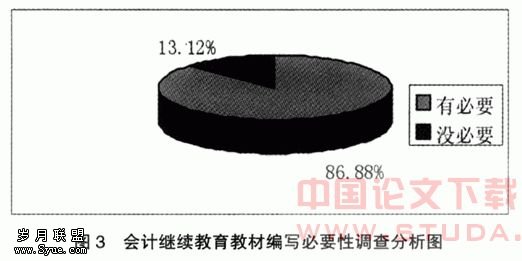 对会计继续教育教材编写的必要性调查,主要是针对当前会计继续教育没有专门教材的现状展开的。在回收的1044份有效调查表中,有907份认为应该编写专门的会计继续教育教材,占86.88%;只有137份认为没有必要编写,仅占13.12%。