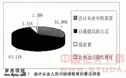 按照财政部最新发布的《会计人员继续教育规定(征求意见稿)》(财办会[2004]7号)中的要求,会计人员继续教育的对象是已取得中华人民共和国财政部统一样式、统一编号规则的会计从业资格证书的人员,包括已取得会计从业资格证书的香港特别行政区、澳门特别行政区和地区居民、外国人。但是,随着知识的到来,不同层次的会计人员包括会计管理人员、会计教研人员和会计实务工作者都面临着知识更新问题。由于会计继续教育只重视持证会计人员的知识更新,造成一部分会计管理和教研人员忽视了对日常工作中较少用到的新知识的学习。这在本次调查中已有所体现,比如:会计从业人员对继续教育的看法上,有31%的人认为继续教育只是年检的需要,有1.38%的人没有参加过继续教育,另有3.51%的认为没必要开展继续教育。这部分的比例加起来占了35.89%。这说明会计继续教育在会计从业人员中的培训效果受到了很大影响。