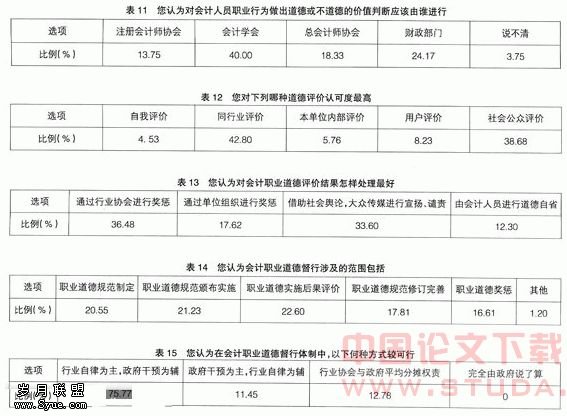 从表12可以看出,会计道德评价的认可度依次为同行业评价,社会公众评价、用户评价、本单位内部评价和自我评价。可以看出,同行业评价和社会公众评价认可度是比较高的。而选择本单位内部评价和用户评价的仍占有一定比例,说明会计人员希望在会计道德评价中享有一定的话语权。