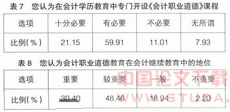 从表7和表8可以看出,绝大多数受访者已经认识到会计职业道德教育的重要性和意义,但还是有部分受访者对会计道德教育的作用持怀疑态度,应该引起重视。