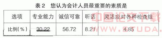 从表2可以看出,超过半数受访者将“诚信可靠”作为会计人员素质的首要标准,说明会计人员还是很愿意讲诚信的。“专业能力”排在第二位,说明会计很看中专业能力,专业能力是不出现技术假账的前提条件。