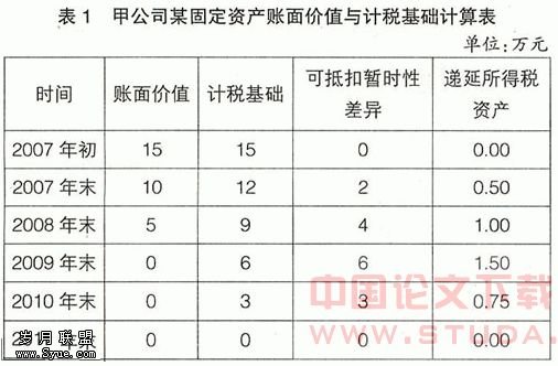 假设2007-2011年会计利润均为1 000万元,所得税税率是25%,不考虑减值因素,2007年初不存在递延所得税资产、递延所得税负债,则2007-2008年各年末资产负债表上资产的账面价值与计税基础会存在差异。该固定资产投入使用时,资产的账面价值与其计税基础相等,但在投入使用后,因税法与折旧年限不同,使得前期会计年折旧额大于税法规定,就会使各年末资产的账面价值小于计税基础,产生可抵扣暂时性差异,带来递延所得税资产。具体如表1: