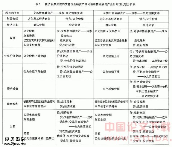 企业购买股票形成由《企业会计准则第22号——金融工具确认和计量》规范的交易性金融资产或可供出售的金融资产时,其会计处理的过程比较分析如表1。(见下页)
