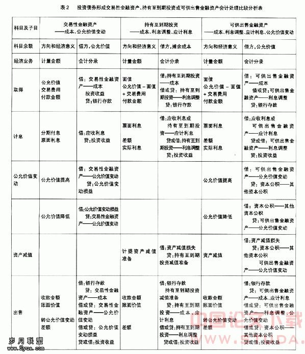 企业购买债券形成交易性金融资产、持有至到期投资或可供出售金融资产的比较分析如表2所示: