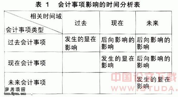 某一时间域的会计事项发生以后,会对会计要素发生影响,这种影响首先表现为对它所在的时间域的作用。就是对价值、数量引起的显在变化。除此之外,由于会计事项影响的时间后向性,该会计事项对其发生之后的时间域会有影响,对后来时间域的这种影响也会引起相应的时间域的会计要素的变动,这就是说,会计事项的后向影响又会对会计要素有影响,对此会计也应该给予计量反映。因此,某一会计事项发生以后,对它对会计要素影响的会计计量,除了要反映它所在时间域的会计要素的显在影响以外,还要反映它的后向影响所波及的时间域的会计要素的影响。会计对会计事项的影响的计量内容如表1所示: